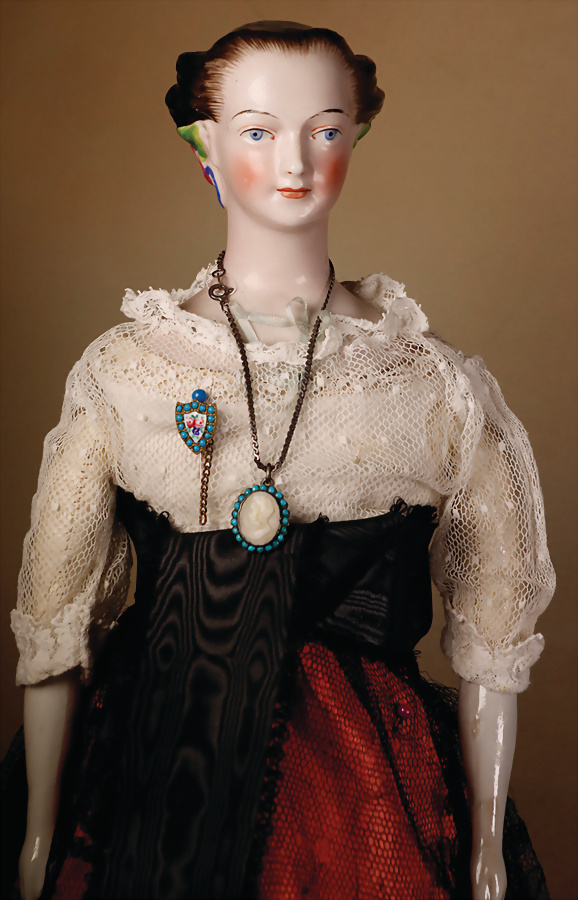 damenhafte glasierte Porzellan-Schulterkopf-Puppe mit zart getöntem Teint, herzförmigem Gesicht und langem, elegantem Hals, braun gemaltes Haar, vom Gesicht weg frisiert, seitlich hoch gelockt mit modellierten Morning-Glory-Blüten hinter den Ohren, hellblaue gemalte Augen, roter und schwarzer Lidstrich am oberen Lid, einstrichig gemalte Augenbrauen, betonte Nasenlöcher, abgenähter Lederkörper, glasierte Unterarme, 45 cm, Haarriss an der Brustplatte, Provenienz: „Sammlung Frohnwieser“