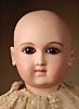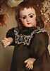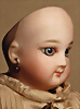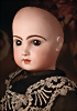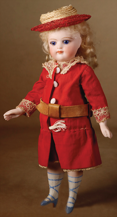 außergewöhnlich schöne und frühe Portrait-Bébé aus dem Hause Jumeau, gefertigt um 1887, drehbarer Biskuitkopf, besticht durch besonders große, faszinierende hellblaue Glasaugen in sogenannter „wrap-around“-Ausführung mit spiralförmiger Fadenstruktur, kräftiger Lidstrich, fein gemalte Wimpern sowie zart mauve schattierter Lidschatten verleihen dem Gesicht eine außergewöhnliche Tiefe und Ausdruckskraft, filigran ausgeführte, gefiederte Augenbrauen, fein schattierte Nasenflügel sowie geschlossene Mund mit klar definierter Lippenkontur, blonde Mohair-Perücke, orig. Korkdeckel, originaler französischer Körper aus Komposition und Holz, mit acht losen Kugelgelenken gearbeitet und feste Handgelenken, 40 cm, originales Antike Robe aus feinster Seide in tiefem Bordeaux, gearbeitet als zweiteilig wirkendes Ensemble mit jackenartig geschnittenem Oberteil, akzentuiert durch kontrastierende Paspelierung, mehrstufiger Volantrock. Ein außergewöhnlich qualitätsvolles, stilistisch raffiniertes Kostüm mit leicht uniformem Charakter und musealer Ausstrahlung. Markierung: 0 (Kopf ) Körper ohne Markierung Zustand: insgesamt ausgezeichneter Zustand, Körper teilweise mit kleinen Farbretuschen