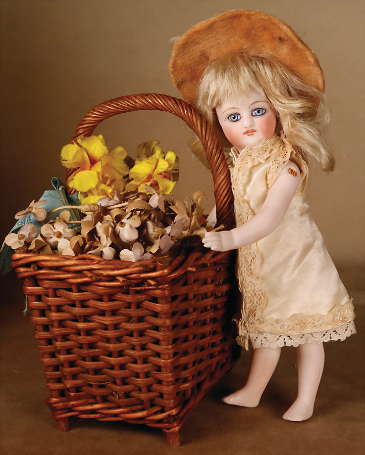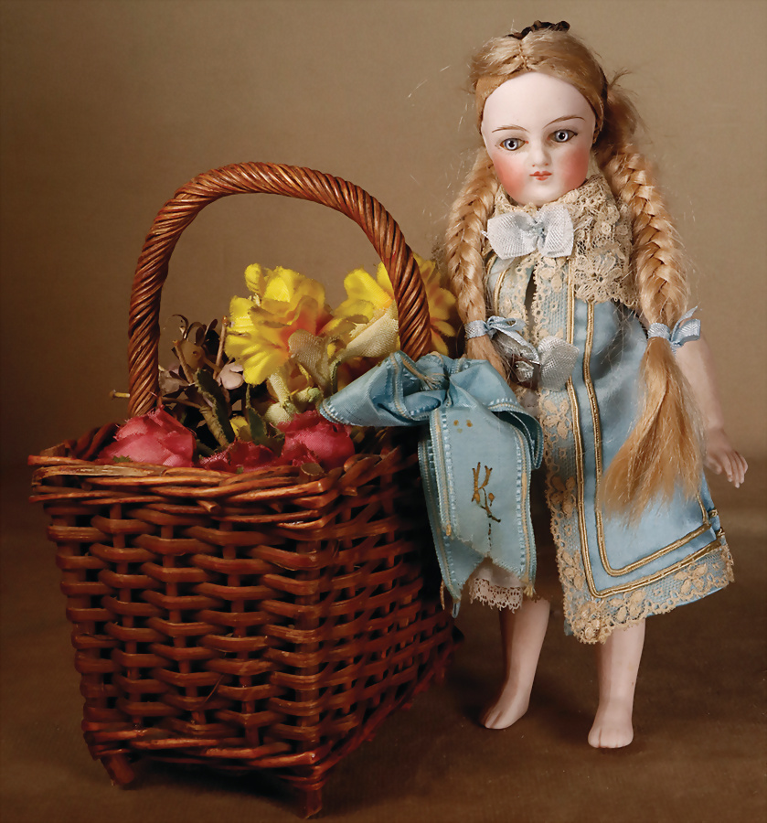Sehr schöne französische Barfuß-Mignonette, Frankreich, um 1885. Biskuitporzellan-Kurbelkopf, eisblaue fest einges. Glasaugen, kleiner geschl. Mund, errötete Wangen, Biskuit-Körper mit bewegl. Armen und Beinen, fein ausgeformte Finger, sehr schönes Seidenkleid aus alten Stoffen genäht, orig. Korkdeckel mit blonder geflochtener Perücke, 17 cm, Kopf Markierung: X Zustand: allgemein schöner Zustand, ursprünglicher Haarriss an der Kopfkrone Provenienz: '' Zeitlose Eleganz der Modepuppen Ikonen, die Frohnwieser Collection''
