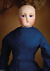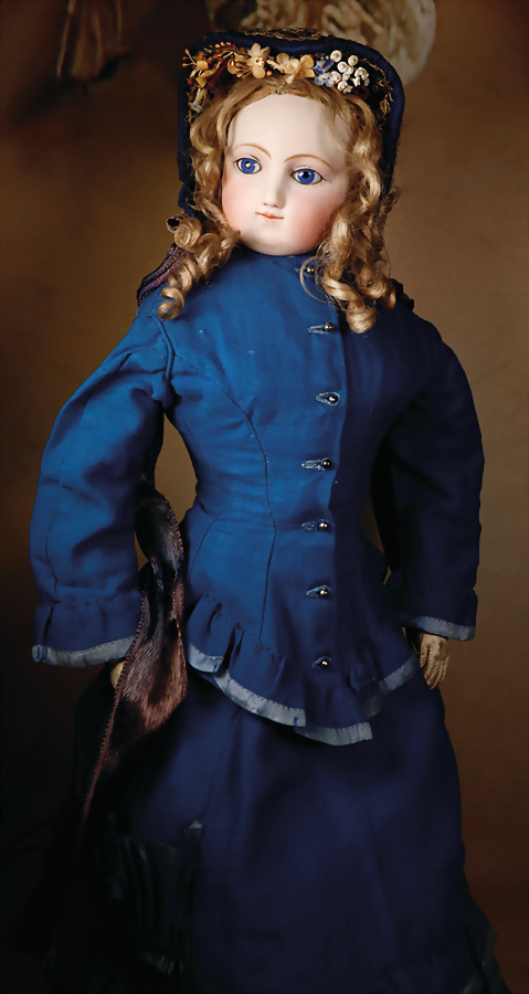 Liebliche französische Modepuppe, um 1875, Kurbelkopf auf Biskuit-Brustblatt, kobaltblaue fest einges. emaillierte Glasaugen, Kopf aus hellem Porzellan, gefiederte hellbraune Augenbrauen, zarter schwarzer Lidstrich, geschl. Mund mit akzentuierten Lippen sowie Nasenlöchern, zart rosafarbener Lidschatten, volle errötete Wangen, durchst. Ohrlöcher, abgenähter Ziegen-Lederkörper mit abgenähten Kniezwickeln und einzeln abgenähte Finger, ausgeprägter Taille, Brustansatz, 54 cm, schönes antikes blauen Kostüm mit hellblauer Seide, orig. Korkdeckel, mit gelockter Perücke und passender Seidenhaube Wertigkeit: Fashion Doll mit feinem, makellosem Biskuit, sehr sanftem Ausdruck Zustand: allgemein exzellenter Zustand Provenienz: '' Zeitlose Eleganz der Modepuppen Ikonen, die Frohnwieser Collection ''