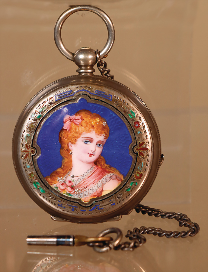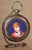 Schöne dekorative Damen-Taschenuhr, Savonette, mit römischen Zahlen, geeignet für französische Modepuppen, fein gearbeitetem Gehäuse und dekorativem Emaille-Medaillon auf dem Sprungdeckel sowie auf dem Gehäuseboden, zentrales Porträt einer jungen Dame mit floralem Haarschmuck, leuchtend kobaltblauem Fond, umgeben von zart gravierter und partiell farbig akzentuierter Ornamentik, silbernes Gehäuse mit Innenpunzen auf Cuvette 98035, Schweizer Ankerwerk, auf der Werkplatine mit „Patent“ graviert, klassische Kronenaufzugs-Konstruktion mit seitlicher Drückerstellung, um 1900 mit charakteristischem Jugendstil-Charme, auf Funktion nicht geprüft, Dm: 4 cm, im kleinen farblich abgestimmten Seidenkörbchen Provenienz: '' Zeitlose Eleganz der Modepuppen Ikonen, die Frohnwieser Collection''