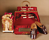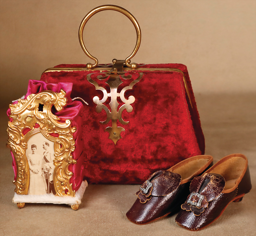 Luxuriöse Dekoration für große Bébé oder Fashion Doll, weinrotes Nähnecessaire mit originaler Innenausstattung, um 1900, sehr schöner Seidensamt außen, innen mit passender weinroter Seide mit Utensilien, Messing-Griff, H: 17 cm x B: 15 cm, dazu kleines Seiden-Container mit Messing-Blech vergoldeten Zierbeschlag, auf 4 Füßen, hervorragender Zustand, H: 11 cm, 1 x französische Puppenschuhe, mit kleinen Absätzen, L: 8 cm B 3 cm, Markierung Nr. 8 Provenienz: '' Zeitlose Eleganz der Modepuppen Ikonen, die Frohnwieser Collection ''