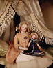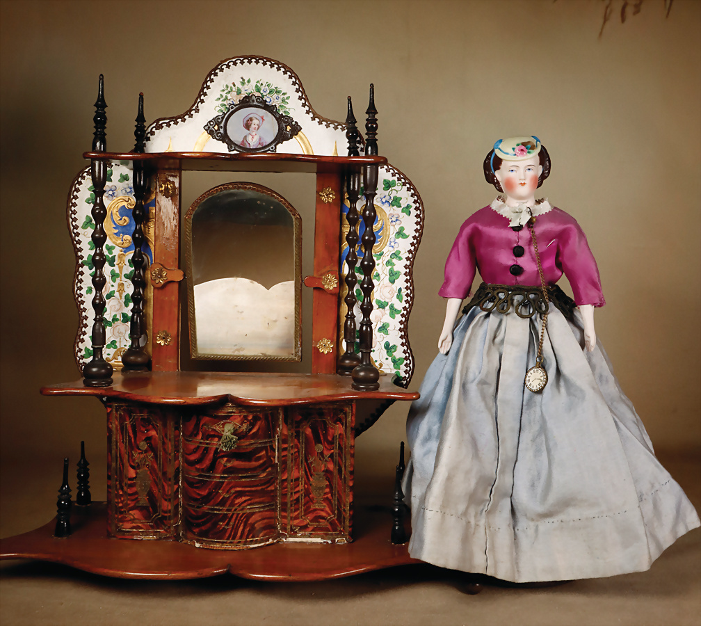 Puppen-Waschkommode mit Spiegelaufsatz, um 1890, geschwungener Sockel und profiliertem Spiegelaufsatz, poliertes Holz mit gedrechselten schwarzen Säulen, Papiermaché-Rückseite mit Blattmotiven sowie mit goldgetönten Ornamenten, 1 Fuß fehlt, H: 32 cm, B: 29 cm, dazu feine Biskuit-Porzellan Brustblatt-Kopf Puppe mit modellierten Hut, zurück gekämmte dunkelbraune Haare in einzelnen Locken gelegt, flacher Hut mit modellierter Rose, blaue gemalte Augen, Biskuit-Unterarme, Porzellan-Unterschenkel mit modellierten Stiefeln, Provenienz: '' Zeitlose Eleganz der Modepuppen Ikonen, die Frohnwieser Collection''