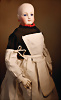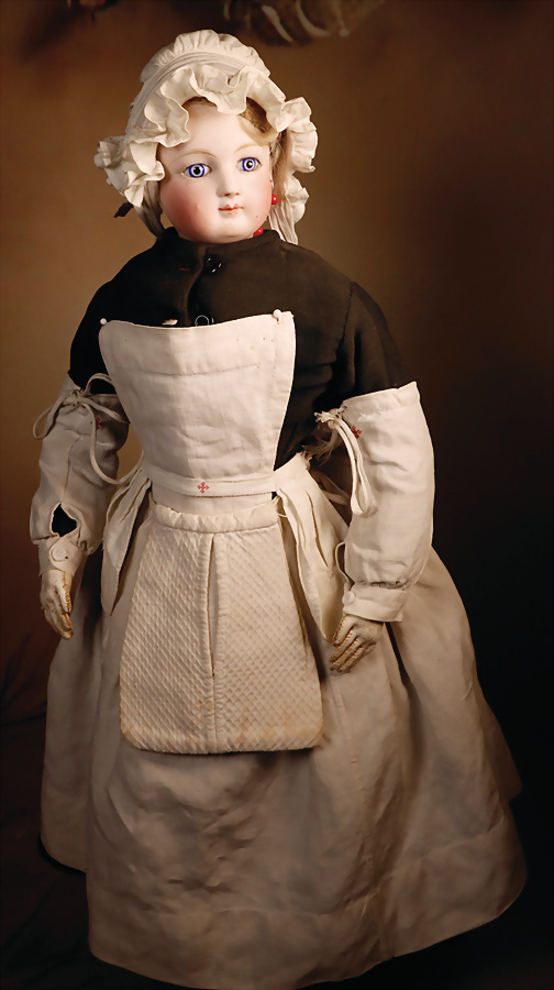 französische Fashion Doll, Krankenschwester, Biskuit-Porzellan-Kurbelkopf, Glas-emaillierte Augen, dunkler Lidstrich, gemalte Wimpern, geschwungene, gefiederte Augenbrauen, akzentuierte Nasenlöcher, geschlossener Mund mit Akzentlinie zwischen den blassen Lippen, modellierte durchst. Ohren, blondes Echthaar auf Korkdeckel, französischer Ziegenleder-Körper mit Kniewickeln sowie einzeln abgenähte Finger, Krankenschwester-Robe, 43 cm Zustand: allgemein ausgezeichnet. Bemerkungen: Französisch, um 1875, Pierre-François Jumeau kleine Fehlstelle am rechten Unterschenkel, kleine Unebenheit an der rechten Wange Provenienz: '' Zeitlose Eleganz der Modepuppen Ikonen, die Frohnwieser Collection''