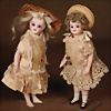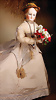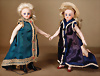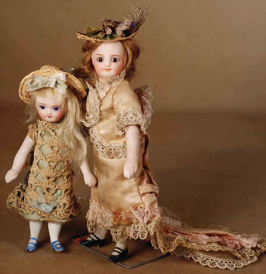 Französische Mignonetten, 1 x Braut, feinstes Biskuitporzellan-Kurbelkopf, braune fest einges. Glasaugen, geschl. Mund, fest aufges. Perücke, modellierte Schuhe und Strümpfe, Kleidung eingenäht, 14 cm, dazu kleine Mignonette, blaue fest einges. Glasaugen, geschl. Mund, bewegl. Arme und Beine, 11 cm, modellierte hellblaue Schuhe und Strümpfe, Kleidung eingenäht Provenienz: '' Zeitlose Eleganz der Modepuppen Ikonen, die Frohnwieser Collection''
