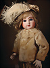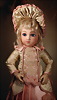 DER Puppenstar, frühes Luxus-Bébé von André Thuillier mit dem unverwechselbaren Ausdruck, um 1882, mit ihren 43 cm zählt sie zu den begehrten kleinen Bébés, drehbare Biskuitkopf, große fest eingesetzte wasserblaue Paperweight-Glasaugen, kräftig akzentuierten Lidstrich sowie fein ausgeführte Wimpern und Augenbrauen, mauvefarben schattierte Augenlider, dezent betonte Nasenflügel und Augenwinkel sowie der geschlossene Mund mit klar definierter Lippenkontur und charakteristisch herzförmiger Oberlippe, durchstochene Ohren, blonde Mohair-Perücke auf Korkdeckel, französische Körper, vollständig gegliedert, gekleidet ist die Puppe mit einem reizvollen rosa / creme Seiden Kostüm mit passender Haube, das ihre klassische Eleganz unterstreicht, zusätzlich eierschalenfarbenes zweiteiliges Kleid, 43 cm Marke: A 6 T. Zustand: Insgesamt sehr hervorragender Zustand, mini Chip am rechten Ohrläppchen überarbeitet sowie kleiner Farbabrieb an der Nasenspitze