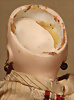 Pierrot, französisch, um 1880, feines Biskuit-Porzellan, Brustblatt-Kopf, fest einges., braune Glasaugen, geschl. Mund, durchst. Ohren, gefiederte Augenbrauen, fest aufges. Perücke, Haarriss an der Hinterseite der Schulterplatte, Baumwollkleidung, auf Holzstab, mit Quietsch-Ton, 33 cm Provenienz: '' Zeitlose Eleganz der Modepuppen Ikonen, die Frohnwieser Collection''