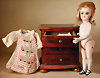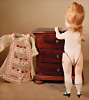 große herrschaftliche Mignonette von Kestner um 1880, feinstes Biskuitporzellan-Kopf, hellblaue fest einges., Glasaugen, gefiederte Augenbrauen, akzentuierte Nasenlöcher, voller gemalter Mund, Biskuit-Körper, modellierte Absatzschuhe und Strümpfe, 22 cm, dazu Puppen-Kommode mit Intarsienarbeiten, 3 Schubladen, 1 x passendes Überkleid aus feinfädigem Musselin, Wertmerkmale: feinstes Biskuit sowie Bemalung, sehr dekorativ, Kopf Markierung: 2 Zustand: 2 Chips an den linken Oberschenkel, sowie recht lockere Befestigung der Beine Provenienz: '' Zeitlose Eleganz der Modepuppen Ikonen, die Frohnwieser Collection''