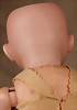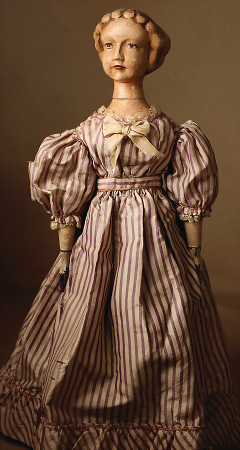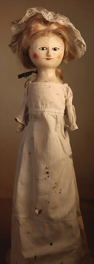 Englische Holzpuppe (Dame), 18. Jahrhundert, mit originaler Bemalung, einteilig geschnitzter Holz-Kopf und -Torso mit flach geschnitzter Rückseite, langgezogenem Hals, schwarz umrandete Emaille-Augen, Punktbrauen, spitz modellierte Nase, feine Mundlinie mit herzförmiger Mitte, Wangen mit zarten Rougepunkten, einfache Holzarme sowie fußlose Beine, 33 cm, bekleidet mit antikem Baumwollkleid, aufgesetzte blonde Mohair-Perücke