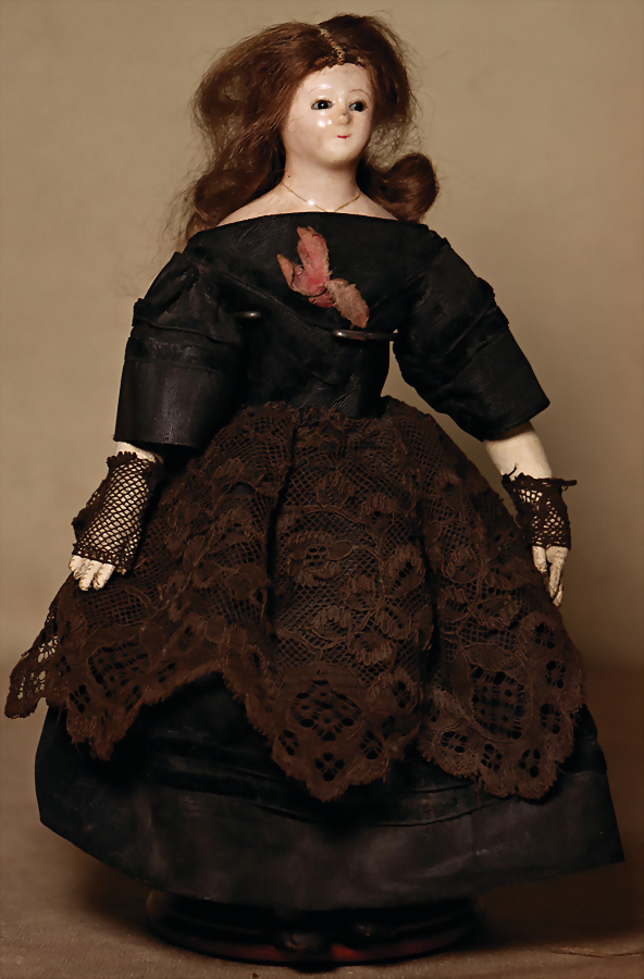 Französische Papier-maché-Poupée, um 1840, Papier-maché-Schulterkopf mit schwarz bemalter Kopfplatte, fest aufgesetzte Mohairhaare, zarte filigrane Bemalung, fest eingesetzte kleine Glasaugen, geschlossener Mund, tief heruntergezogene Brustplatte mit leicht angedeuteten Brustansatz, aufgemalte Kette mit Kreuz, Ziegen-Lederkörper, einzeln abgenähte Finger, antikes schwarzes Kleid, 23 cm