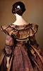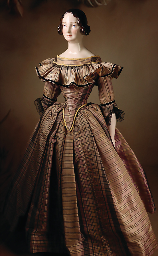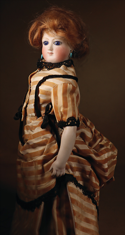 Französische Biskuit-Poupée, um 1860, heller Biskuit-Porzellan-Kopf auf Biskuit-Brustplatte, mit fest einges. kobaltblauen Glasaugen, dunkler Lidstrich, gemalte Wimpern, fein gefiederte Brauen und akzentuierte Nasenpartie, errötete Wangen, geschlossener Mund mit betonten Lippen, durchstochene Ohren, rot/blonde Mohair-Perücke über Kork-Deckel, schlanker Ziegenlederkörper, Biskuit-Unterarme, 37 cm, Robe aus alten Stoffen gearbeitet.