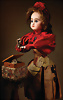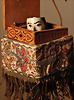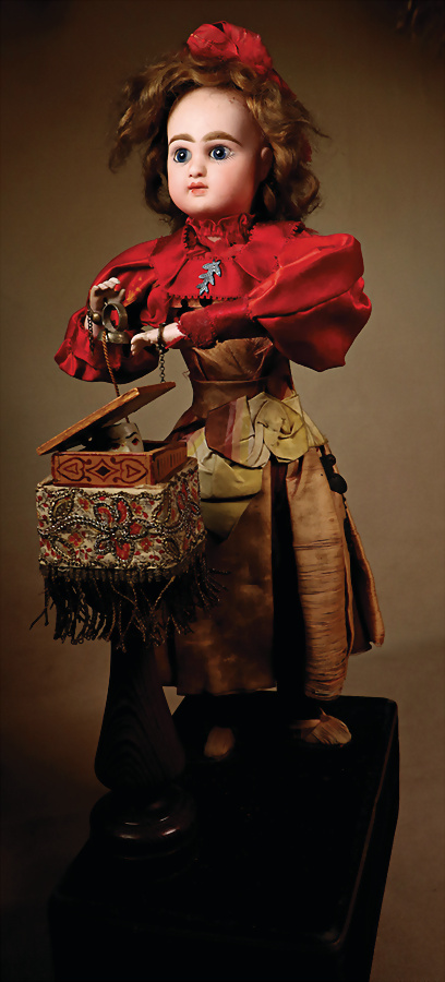 Puppenautomat, Frankreich, Zauberer, Harlekin aufsteigend, ca. 1890, Biskuit-Kurbelkopf, JUMEAU, fest einges., blaue Glasaugen, geschl. Mund, Porzellan-Unterarme, 1 Hand gebrochen u. geklebt, Orig.-Perücke wurde nicht entfernt, von außen keine Risse erkennbar, Puppe hebt beide Arme, aus einer Box tritt ein Harlekin-Kopf hervor, sehr schöne Orig.-Kleidung, Musikspielwerk intakt, kl. altersbed. Fehlstellen an der Seide, H: 44 cm