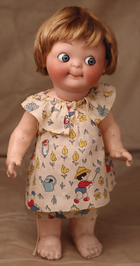 seltene Googly-Charakterpuppe von Heubach Köppelsdorf, Modell 318.1/7 um 1923 A. H. Schalkau D. R. G. M., blaue seitlich blickende große Runde Googly-Augen, die der Puppe einen unverwechselbar verspielten Ausdruck verleihen, Melonen-Mund, kleine Stupsnase, zart gemalte Wimpern, auf stämmigem Masse-Körper, bewegliche Arme und Beine, 26 cm, liebenswürdigem Lächeln unterstreichen den charmanten Gesichtsausdruck, der auf besondere Weise Schelmisches und Unschuld vereint, kurze blonde Mohair-Perücke Marke: Heubach Köppelsdorf 318 7/0 Germany A.H. Schalkau DRGM. Zustand: insgesamt ausgezeichnet CH-ID 1013, das Objekt befindet sich im Schweizer Zolllager, für Bieter außerhalb der Schweiz muss ein Versand vorgenommen werden, bei Einfuhr in die EU fallen Zoll, Umsatzsteuer u. Bearbeitungsgebühren an, für Bieter außerhalb der EU gelten die dort üblichen Zollbedingungen, Provenienz: Sammlung ,, Cecilie Juul Møller "
