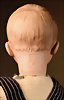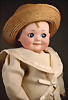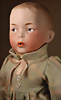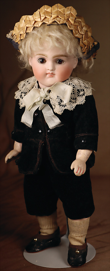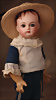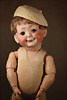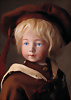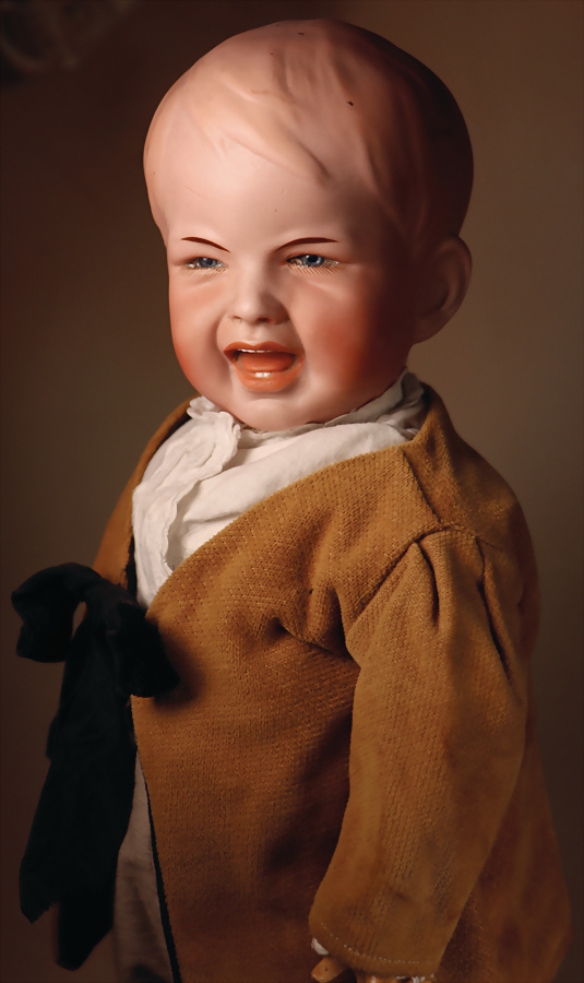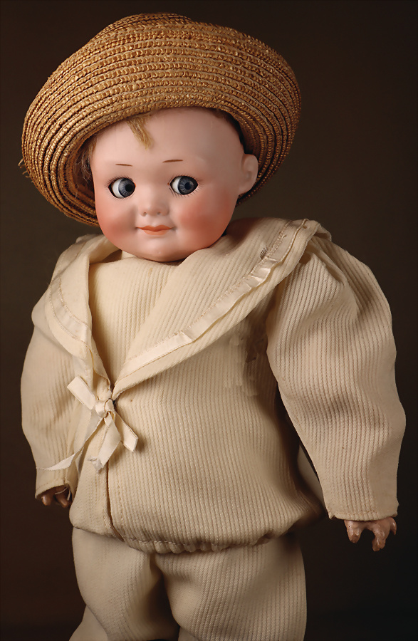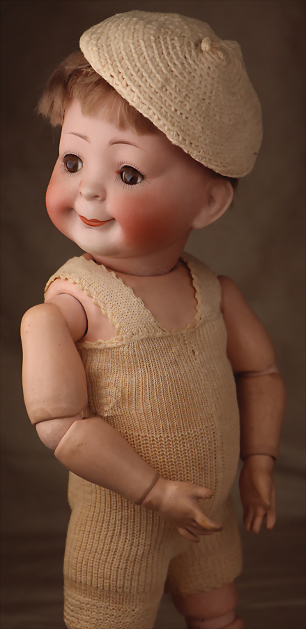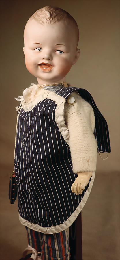 „Whistling Jim“ – Charakterpuppe von Gebrüder Heubach, um 1910, Biskuitkopf zeigt modelliertes, hellblondes, kurz geschnittenes Jungenhaar, seitlich blickenden blauen Intaglio-Augen mit weißen Lichtpunkten, schwarzem Lidstrich und einstrichigen Augenbrauen verleihen dem Gesicht einen lebhaften, leicht schelmischen Ausdruck, betonte Nasenlöcher sowie der fast geschlossene Mund mit kleiner „Pfeiföffnung“ in der Mitte, Stoffkörper ist mit einem Blasebalg im Torso ausgestattet, der ursprünglich einen Pfeifton erzeugte – eine raffinierte Besonderheit dieses Modells, 33 cm Marke: 3774 Heubach Germany Zustand: insgesamt ausgezeichnet