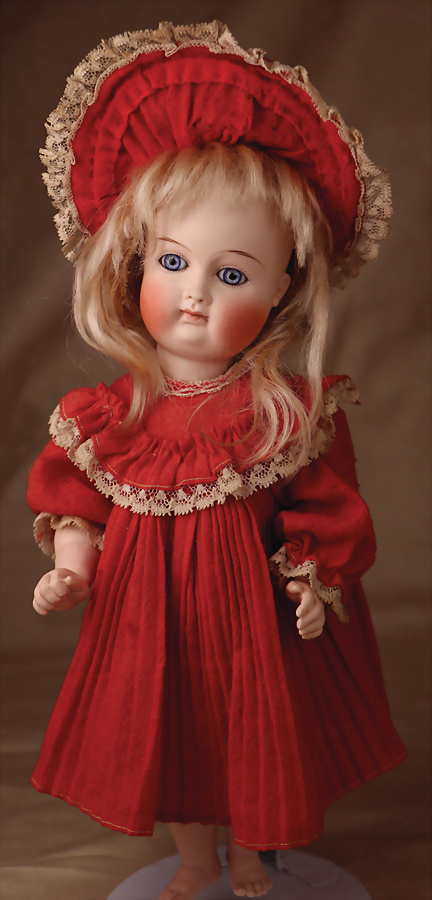 seltene und charaktervolle All-Bisque-Puppe der renommierten Manufaktur J.D. Kestner, gefertigt um 1885, dieses Modell wird unter Sammlern häufig als „French Wrestler“ bezeichnet – eine Anspielung auf die kräftige, plastisch ausgearbeitete Körperform, Kopf und Körper aus Porzellan, blaue Schlafaugen mit Strahleniris, feines helles Porzellan, gefederte Augenbrauen, Nasenlöcher, geschlossener Mund, volle, errötete Wangen, Biskuit-Körper, bewegliche Arme und Beine, extrem fein ausgeformte Hände, unterschiedliche Handhaltung, eine Hand ist zur Fast modelliert, fein ausgeformte Fingernägel sowie Fußzehen und Fußnägel, 28 cm, antikes rotes Kleid, blonde Mohair-Perücke, kleinere restaurierte Fehlstellen an der Bandscheibe, CH-ID 1060, das Objekt befindet sich im Schweizer Zolllager, für Bieter außerhalb der Schweiz muss ein Versand vorgenommen werden, bei Einfuhr in die EU fallen Zoll, Umsatzsteuer u. Bearbeitungsgebühren an, für Bieter außerhalb der EU gelten die dort üblichen Zollbedingungen, Provenienz: Sammlung ,, Cecilie Juul Møller "