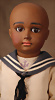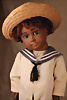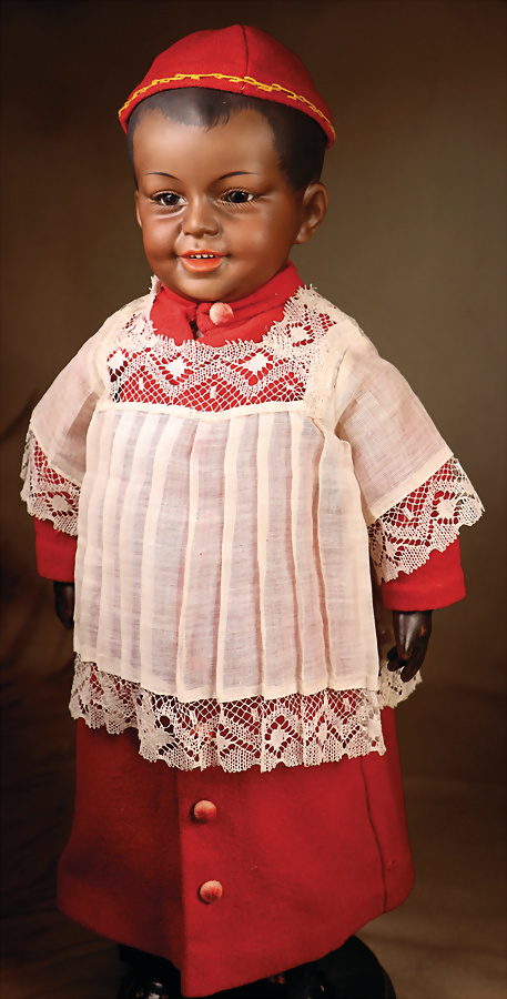 Außergewöhnliche schwarze Puppe der renommierten deutschen Manufaktur J.D. Kestner, gefertigt circa 1885, stilistisch orientiert an den französischen Bébé-Modellen des Typs A.T., besticht sie durch Ausdruck und Eleganz, Biskuit-Porzellankopf Junge, mit zarten hellbraunen-Teint, der zu den begehrtesten Varianten zählt, braunen Glasschlafaugen, fein bemalten Wimpern, schwarzem Lidstrich, staffierten Augenbrauen, passender Gliederkörper, Gipsdeckel, betonten Nasenlöchern und einem geschlossenen Mund mit korallfarben schattierten Lippen, durchstochene Ohren, sehr schöne antike Matrosen-Kleidung, Markierung: Kopf Markierung 11 Zustand: insgesamt ausgezeichnet, vermutlich nachträgliche rosa Retuschen an den Wangen CH-ID 1043, das Objekt befindet sich im Schweizer Zolllager, für Bieter außerhalb der Schweiz muss ein Versand vorgenommen werden, bei Einfuhr in die EU fallen Zoll, Umsatzsteuer u. Bearbeitungsgebühren an, für Bieter außerhalb der EU gelten die dort üblichen Zollbedingungen, Provenienz: Sammlung ,, Cecilie Juul Møller "