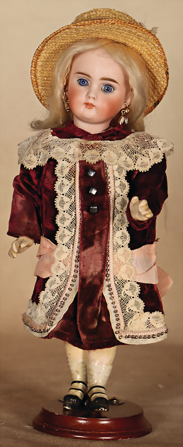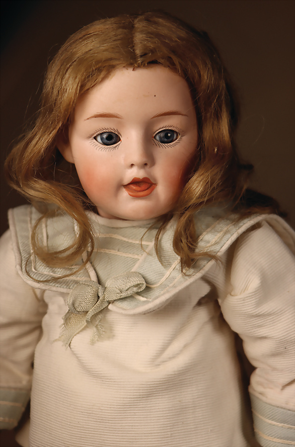 außergewöhnlich schöne und seltene Puppe aus dem Hause Simon & Halbig, Modell 1469, gefertigt um 1910, mit einer Größe von ca. 36 cm, verkörpert sie den eleganten Frauentyp der frühen 20. Jahrhunderts, drehbare Biskuitkopf, zart modelliertes, herzförmiges Gesicht mit fein ausgearbeitetem Kinn und elegant verlängertem Hals, blauen Schlafaugen aus Glas, fein gemalte Wimpern, schattierte Lippen, akzentuierte Nasenflügel sowie fein gezeichnete Augenbrauen unterstreichen die hohe Qualität der Bemalung, gegliederter Kompositions-Körper zeigt eine erwachsene, weibliche Formgebung mit schlanken Gliedmaßen, Füße sind in typischer Weise so gearbeitet, dass sie für das Tragen von hochhackigen Schuhen geeignet sind – ein reizvolles Detail dieser Epoche, antikes Polka Kleid, originale Mohairperücke, , 38 cm Zustand: Insgesamt hervorragend, kleiner ursprünglicher Brandriss an der Kopfkrone, davon kein Haarriss ausgehend, kleinere farbliche Retuschen an dem rechten Arm und linken Fingern CH-ID 1049, das Objekt befindet sich im Schweizer Zolllager, für Bieter außerhalb der Schweiz muss ein Versand vorgenommen werden, bei Einfuhr in die EU fallen Zoll, Umsatzsteuer u. Bearbeitungsgebühren an, für Bieter außerhalb der EU gelten die dort üblichen Zollbedingungen, Provenienz: Sammlung ,, Cecilie Juul Møller "