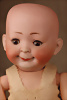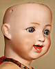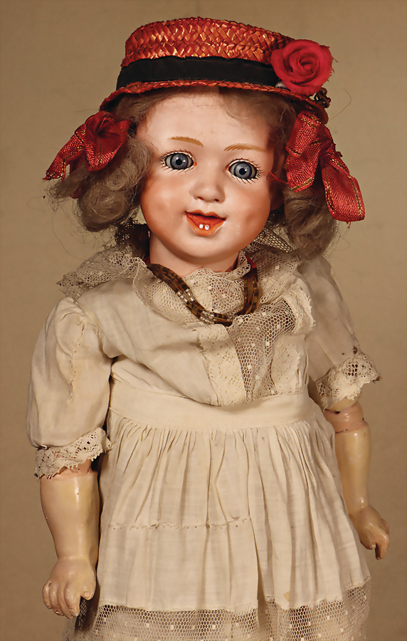 Seltene Charakterpuppe von Gebrüder Heubach, Modell 8191, um 1912, Biskuitporzellan-Kopf mit zart rosé getöntem Teint , kuppelförmiger Kopf, modelliertes, kurz gelocktes Haar mit charakteristischen Stirnlocken, seitlich blickenden blauen Intaglio-Augen mit weißen Lichtpunkten, betonte Nasenlöcher, plastisch lachender modellierte Mund, Zunge sowie zwei Reihen kleiner Zähnchen, tief modellierten Grübchen und Lachfalten, die dem Gesicht eine natürliche, fast lebensechte Mimik verleihen, Kompositionskörper mit kugelgelenkten Holzgelenken, feste Handgelenke Marke: Heubach (im Quadrat) 8191 Germany, 34 cm Zustand: insgesamt ausgezeichnet, ausgebesserte Stelle an der Halskurbel des Körpers
