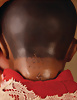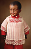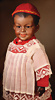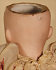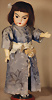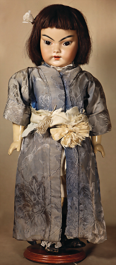 Burmesin von Simon und Halbig, Porzellan-Kopf, braune Schlafaugen, off. Mund, oben Zahnreihe, durchst. Ohren, schöne tiefe Modellierung, Masse-Gliederkörper mit festen Handgelenken, Gummis lose, Kleidung altersbedingt porös, 45 cm, Markierung: SH 1199 DEP 8