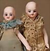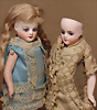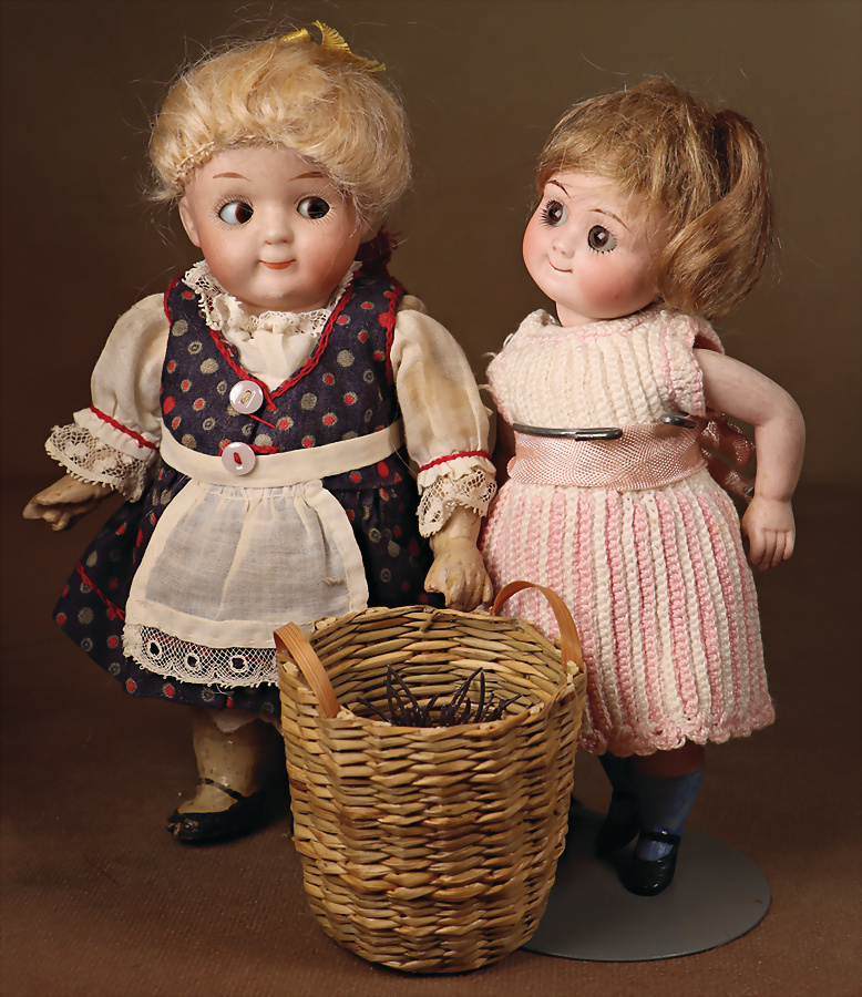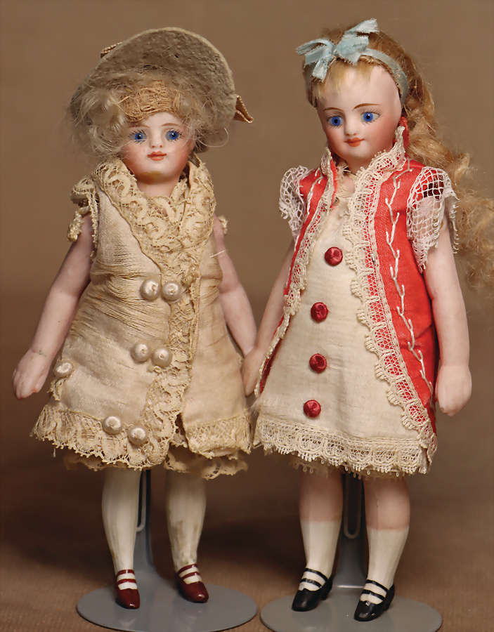 2 feine französische Mignonetten, um 1882, sehr helles Biskuitporzellan-Kopf, blaue fest einges., Glasaugen, geschl., Mund, durchst., Ohren, Biskuit-Torso, Biskuit-Arme und Beine, fein modellierte Hände, 1 x barfüßig sowie 1 x mit modellierte hellblaue Schuhe und Strümpfe, 16 cm, antike Kleidung, entzückendes Pärchen mit toller Präsenz