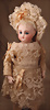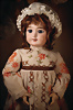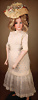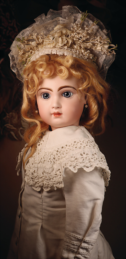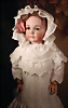 französische Bébé-Puppe von Émile Jumeau, gefertigt um 1886, fein gearbeitete Biskuit-Kopf, mit klaren Konturen, blaue Paperweight-Glasaugen, zart gemalten Wimpern und fein ausgearbeiteten, mit Pinselstrichen gestalteten Augenbrauen, sorgfältig betonte Nasenlöcher sowie der geschlossene Mund mit schattierten Lippen, durchstochene Ohren, braune Mohair-Perücke, französische Kompositions-Körper, 68 cm, antikes weißes Kleid Markierung: Kopf, „Déposé Tête Jumeau Bte SGDG 12“ Körper Stempel „Jumeau Médaille d'Or Paris“ Zustand: zarter Haarriss an der Kopfkrone