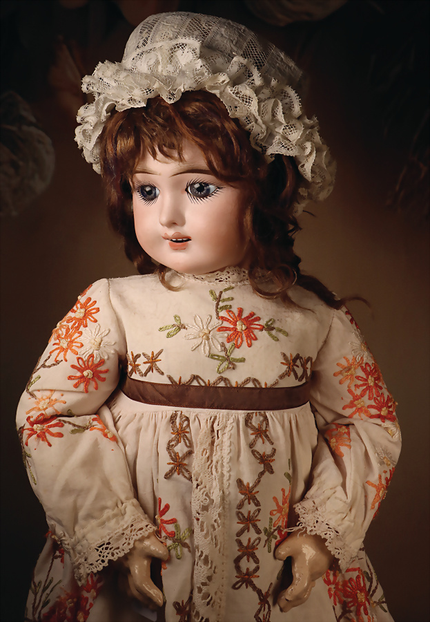 französische „Eden Bébé“, 9, Bisquit-Porzellan Kopf, blaue fest einges., Paperweight Augen, dunkler Eyeliner, geschwungene, gemalte Wimpern, sorgfältig pinsel gezogene, mehrfach gefiederte Augenbrauen, akzentuierte Nasenlöcher und Augenwinkel, leicht geöffneter Mund, mit schattierten Lippen, Echthaarperücke auf Kork-Deckel, durchst. Ohren, französischer Gliederkörper, 59 cm, floral besticktes Kleid Zustand: insgesamt sehr gut, kleine originale Unebenheit im Porzellan über der linken Augenbraue, ein kleiner Finger weggebrochen Markierung: “Eden Bébé Paris 9 Déposé”