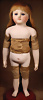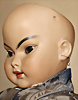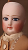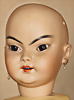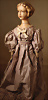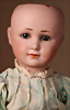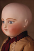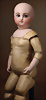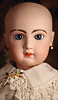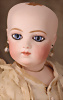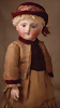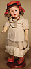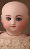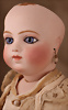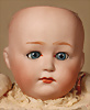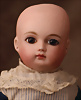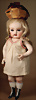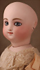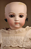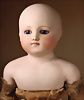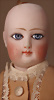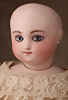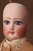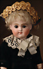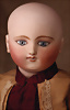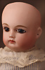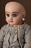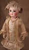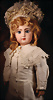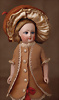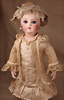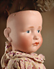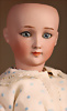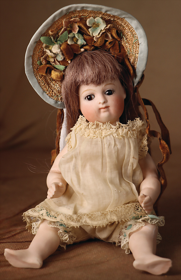 Seltene frühe Biskuitpuppe, wohl Ernst Grossmann, um 1882, drehbarer abgeflachter Biskuitkopf-Vollkopf, fest eingesetzte tiefbraune Paperweight-Augen, fein ausgearbeiteten dunklen Lidstrich, zart gemalte Wimpern sowie leicht gefiederte Augenbrauen, schattierte Augenlider, akzentuierte Nasenflügel und Augenwinkel unterstreichen die feine Modellierung, geschlossene Mund mit klar definierter Lippenkontur und feinem Zwischenraum, errötete Wangen, besonders ruhiger & edler Ausdruck, durchstochene Ohren, früher deutscher Körper aus Komposition und Holz mit festen Handgelenken, antikes Kleid, blonde Mohair-Perücke, 25 cm