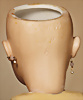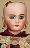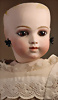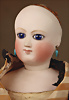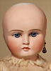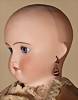 Außergewöhnlich seltene und frühe französische Bébé-Puppe aus der Werkstatt von Jules Steiner, entstanden um 1877, aus der frühesten Phase der Biskuitproduktion des Hauses, das Gesichtsmodell ist inspiriert vom berühmten „Bébé Gigoteur“-Typ, Biskuit-Porzellan-Kurbel-Kopf mit rundlich-vollem Kindergesicht, zarte hellbraune Augenbrauen, fest eingesetzte eisblaue Glasaugen mit Strahleniris, fein gezeichnete Wimpern, akzentuierte Nasenlöcher, geöffneter Mund, akzentuierte Lippen, plastisch ausgearbeiteter Philtrum-Bereich, spitze kleine Zahnreihe oben und unten, durchstochene Biskuit-Ohren, früher, plump wirkender französischer Glieder-Körper mit acht losen Kugelgelenken, antikes Chemise, 42 cm, antike Fellperücke alter Haarriss, am Hinterkopf sehr schöner intensiver Ausdruck Zustand: alter Haarriss am Hinterkopf, sonst sehr schöner allgemein Zustand CH-ID 1024, das Objekt befindet sich im Schweizer Zolllager, für Bieter außerhalb der Schweiz muss ein Versand vorgenommen werden, bei Einfuhr in die EU fallen Zoll, Umsatzsteuer u. Bearbeitungsgebühren an, für Bieter außerhalb der EU gelten die dort üblichen Zollbedingungen, Provenienz: Sammlung ,, Cecilie Juul Møller "