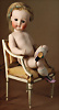 frühe Kestner Miniatur-Puppe, um 1880 fein modelliertes Kniegelenk-Kind, drehbarer Kopf, braune nachträglich fest einges. Glasaugen, fein gemalte Augenbrauen, geschl., Mund, errötete Wangen, Biskuit-Körper, bewegl., Arme, unterschiedliche Handhaltung, bewegliche Biskuit-Beine mit gegliederten Kniegelenken, aufwendig modellierte lila Stiefel mit Spitzen-Kniestrümpfen, 21 cm, dazu passender Puppenstuhl um Markierung: III Kopfmarke, III Torso-Marke Zustand: allgemein sehr schöner Zust., CH #1082, dieses Objekt befindet sich in der Schweiz, es fallen zusätzlich Zoll und Bearbeitungsgebühren an, Provenienz: Sammlung ,, Cecilie Juul Møller "
