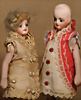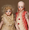 Miniatur-Googly, Pärchen, 1 x von Gebrüder Heubach, um 1920, Biskuit-Kopf, 9373, 16 cm, braune, seitlich blickende, Glasaugen, Masse-Stehkörper, 1 deutsches kleines Vollbiskuit Googly, 292 14, braune seitlich blickende Glasaugen, Melonen-Mund, fest aufges. Perücke, bewegl., Arme und Beine, modellierte Schuhe und Strümpfe, Gummis etwas locker, 18 cm, Provenienz: " Sammlung Gerda Ott "
