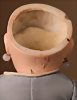 Googly, Modell 323, um 1917, Biskuit-Porzellan-Kopf, blaue Schlafaugen seitlich blickende Glasaugen, gemalte Wimpern, einfache Einzelstrich-Brauen sowie geschlossener Mund mit leicht verschmitztem Ausdruck, Kinngrübchen, Kompositions- und Holzkörper mit Kugelgelenken, 31 cm Markierung: „Armand Marseille Germany 323 A 3/0 M“ Zustand: Insgesamt ausgezeichnet, Provenienz: " Sammlung Gerda Ott "