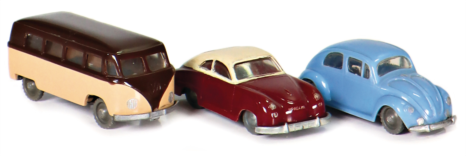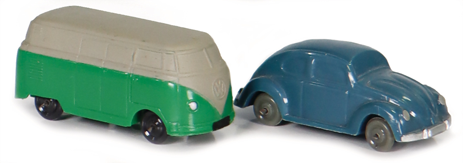 Konv. PKW, früh, VW, ohne Bodenplatte, Achsen außen gequetscht, Bulli, 2-farbig, mit geteilter Frontscheibe, Käfer, mit Brezelfenster, guter Zust.