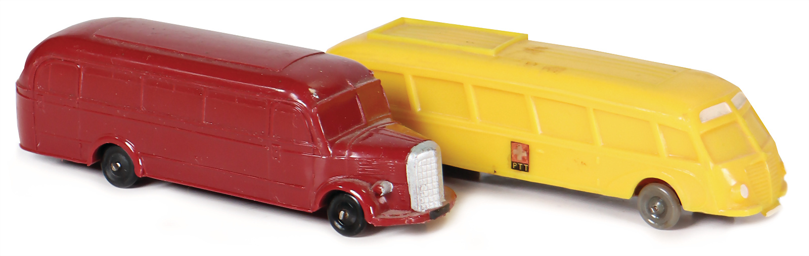 2 Teile, früh, Bus, gelb, mit Bodenplatte und von außen gequetschte Achsen, kl. Kratzer an der Bodenplatte sowie am Dach, sonst gut, 1 Bus, rot, ohne Bodenplatte, Achsen gequetscht, guter Zust.