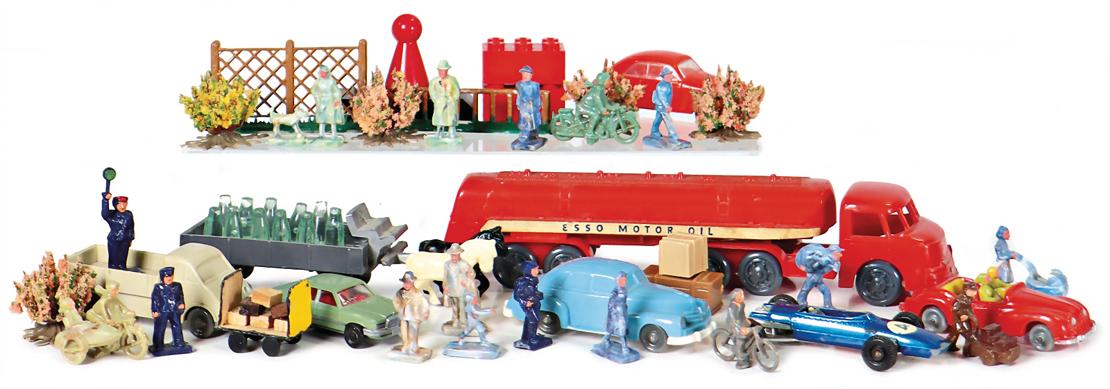 Konv., Cabriolet rot, ohne Bodenplatte, Achsen von außen gequetscht, guter Zust., PKW mit geteilter Frontscheibe, mit Bodenplatte, unverglast, Pritschenwagen, unverglast, Pferdegespann, Achsen von außen gequetscht, nachtr. aufgeklebte Flaschen, 3 Fahrzeuge, andere Hersteller, einige Figuren u. Zubehörkleinteile