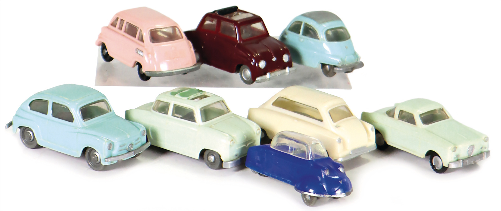 Konv. Plastik, Kleinwagen, 8 Teile, Isetta, Gogo Coupé, Fiat 500, NSU Prinz, Zündapp Janus, BMW 600, Gogomobil, Messerschmitt Kabinenroller, 1 Fahrzeug etwas Farbabrieb am Dach, sonst guter Zust.