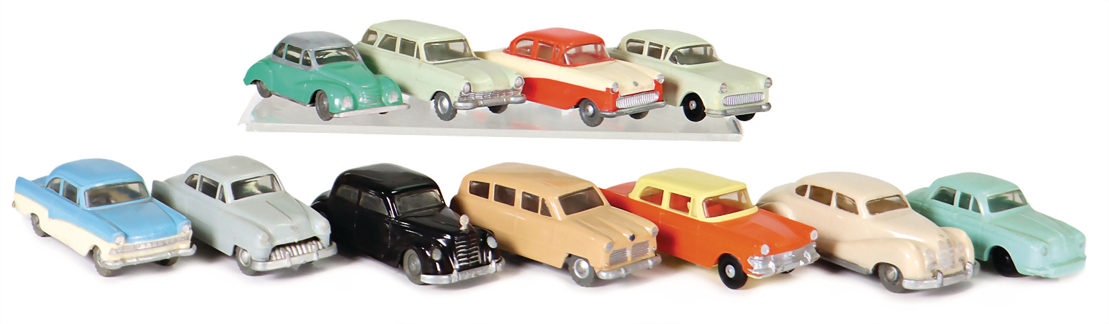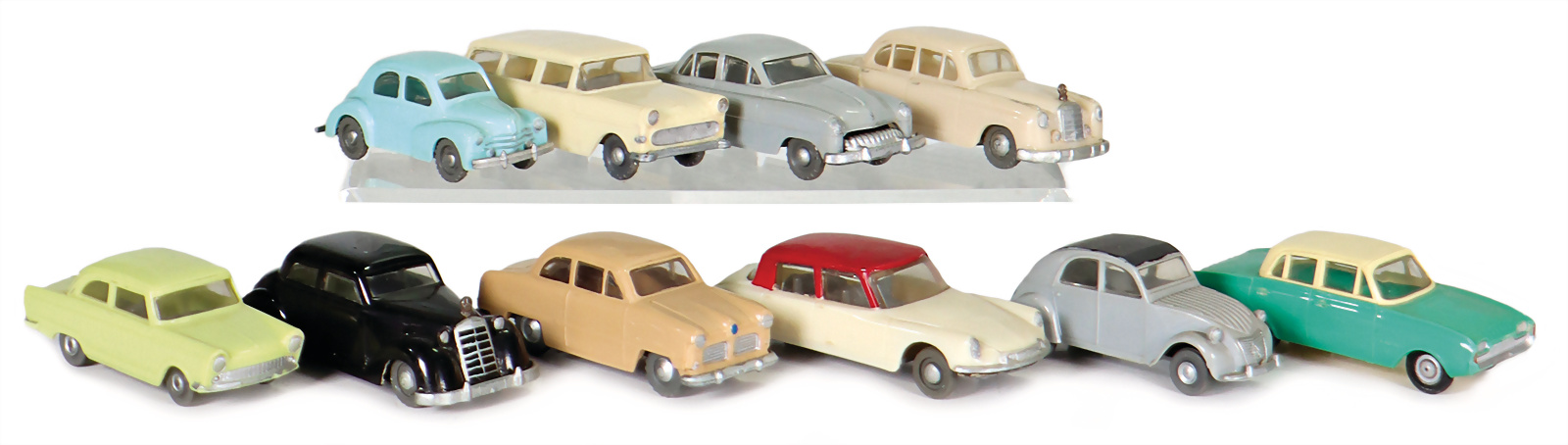 Konv. Plastik, 10 Teile, PKW, BMW 501, Opel 1200, Opel Rekord, 2 versch. Farben, DKW, Sonderklasse, Dach übermalt, Ford Taunus, 17-M, Ford 17-M Kombi, Renault Dauphine, Mercedes-Benz 220, Opel Rekord, guter Zust.