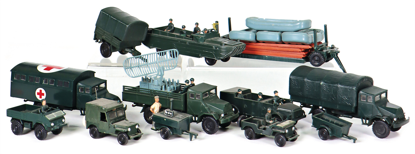 Plastik, Militärfahrzeuge, darunter Jeeps, Amphi-Car, Anhänger mit Schlauchbooten, Radarstation, guter Zust.