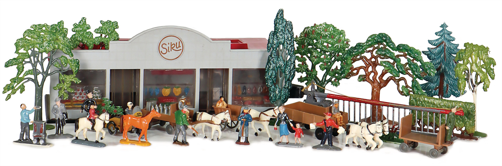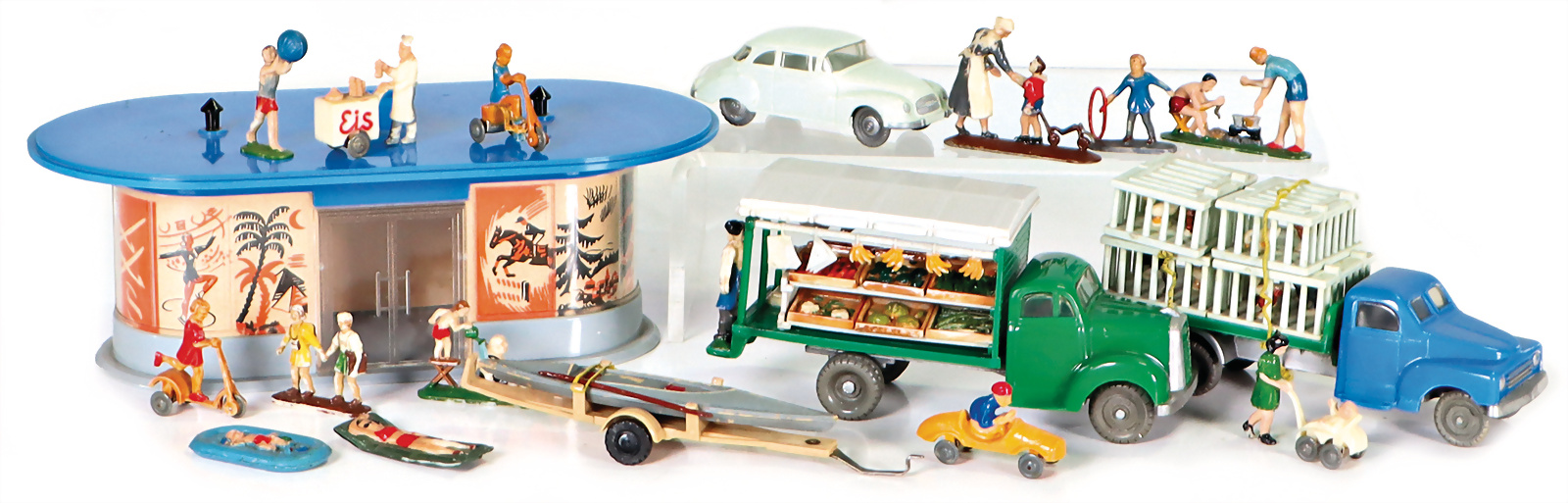 Plastik, Kiosk, Gemüsewagen, Geflügelwagen, Auto Union Limousine mit Bootsanhänger, Freizeitpassanten