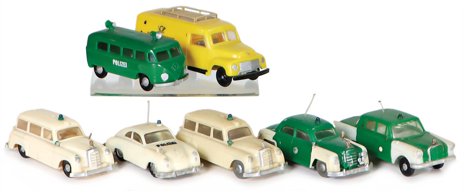 Konv. Plastik, Nutzfahrzeuge, Porsche 356 Polizei, Mercedes-Benz Kombi, Krankenwagen, VW Bulli Polizei, Post LKW, meist guter Zust.