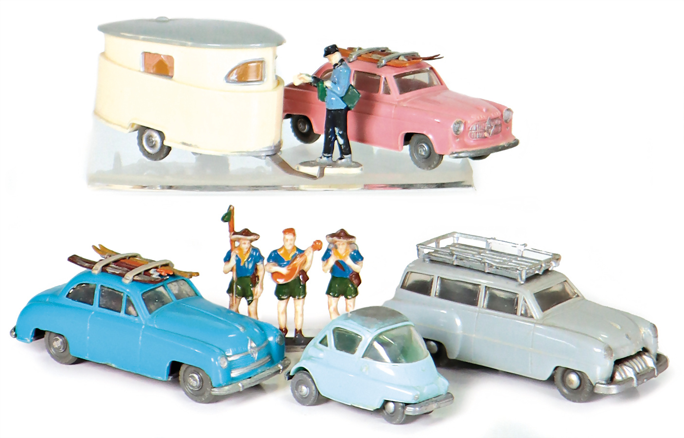 Konv. Plastik, Borgwart, mit Skiern, 2 versch. Farben, Isetta, Farbe am Dach etw. abgerieben, Opel Caravan, 1 Anhänger, Passanten, guter Zust.