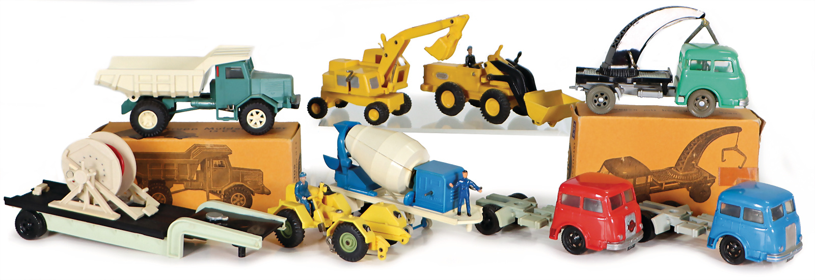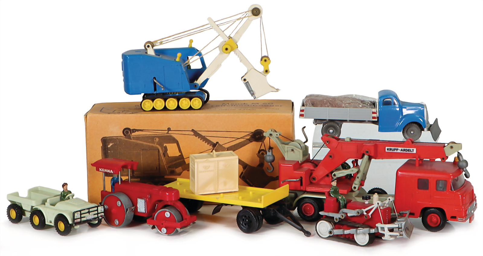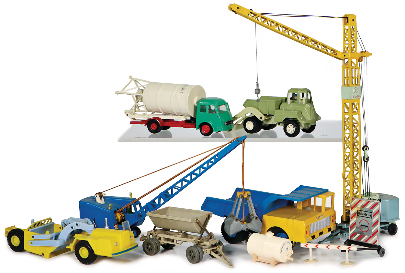 Konv. Plastik, Baufahrzeuge, darunter Krupp Muldenkipper, 105, im Orig.-Kart., Kranwagen, im Orig.-Kart., Bagger, Betonmischmaschine, Schieber, LKW mit Tieflader u. Kabelrolle, guter Zust.