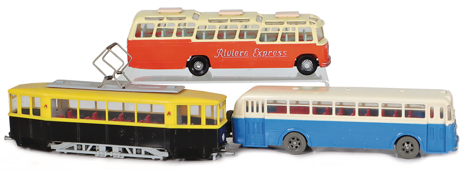 Konv. Plastik, Straßenbahn, 2 Omnibusse, Büssing Riviera Express, 1x Riss am Dach, sonst guter Zust.