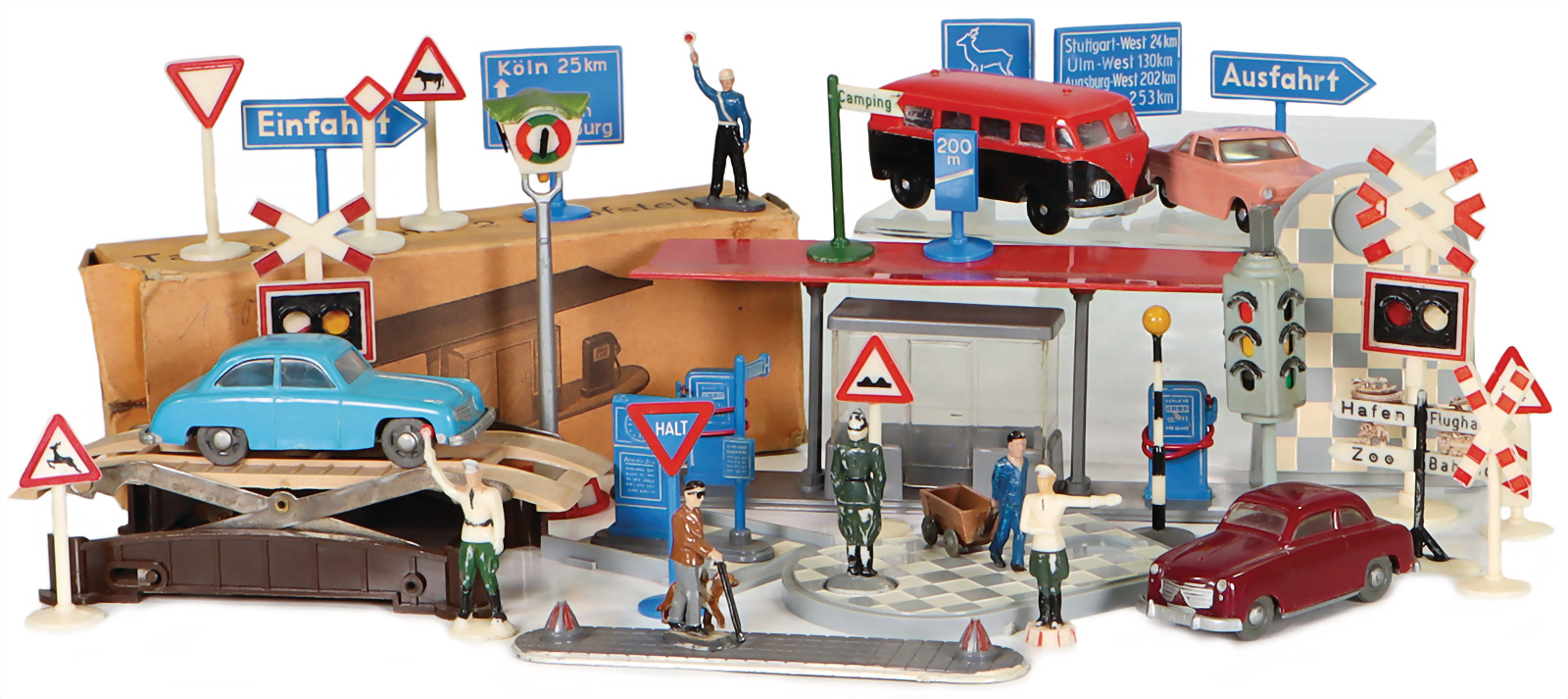Konv. Plastik, 4 Fahrzeuge, VW Bus Bulli, Loyd, BMW 700, Goliath, 1 Tankstelle im Orig.-Kart., Verkehrszeichen, Ampel, Schutzmänner, kl. Haltestelle, guter Zust.