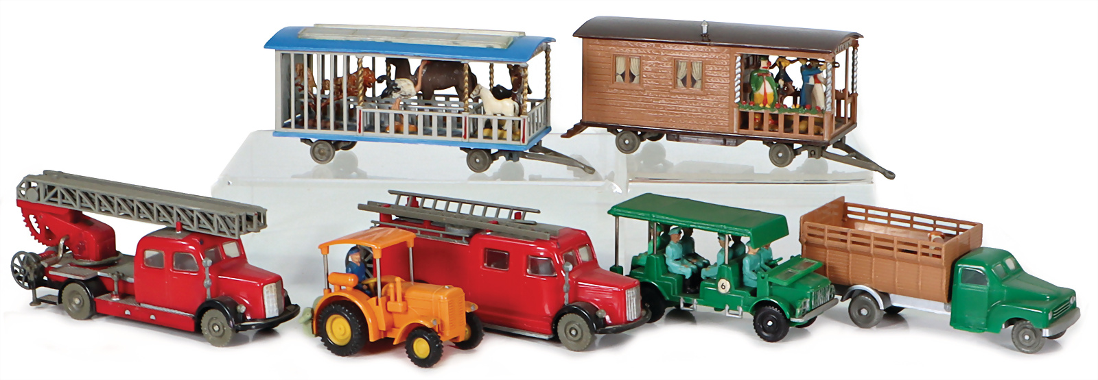 Konv. Plastik, 2 Feuerwehrautos, Mercedes-Benz, Viehtransporter, 1 Zirkuswagen mit Schlepper, 1Wagen, Überfallkommando