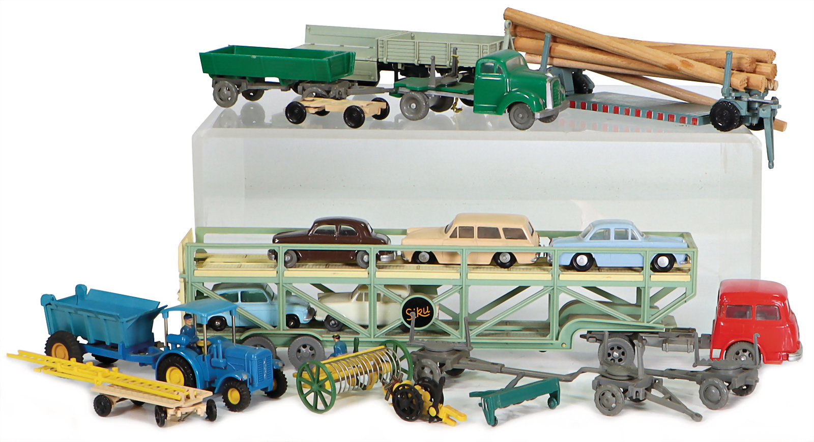 Konv., Plastik, Autotransporter mit 5 Fahrzeugen, LKW mit Holzladung, landwirtschaftliche Fahrzeuge u. Gerätschaften, guter Zust.