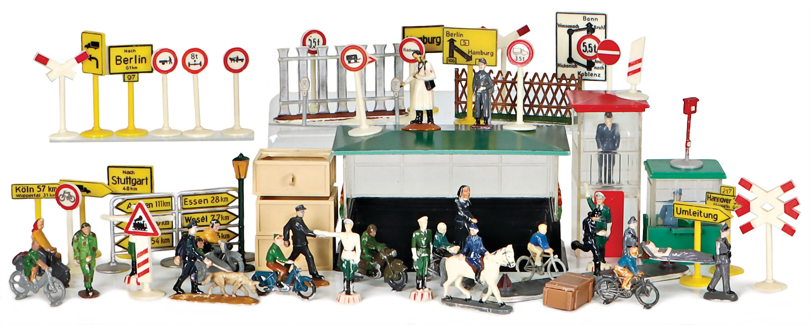 Konv. Plastik, Haltestelle, minim. Fehlstelle, an 1 Kante, kl. Kassenhäuschen, Schutzmänner, Motorräder, viele Verkehrszeichen, Kleinteile, guter Zust.