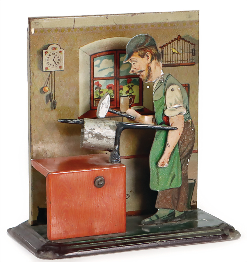 Mechanisches Werkstatt-Diorama, Schmied am Amboss“ / „Hammerwerkstatt“, Blech, lithogr., altersbedingt min., Lackschäden, Funktion intakt, L: 11 cm, H: 12 cm