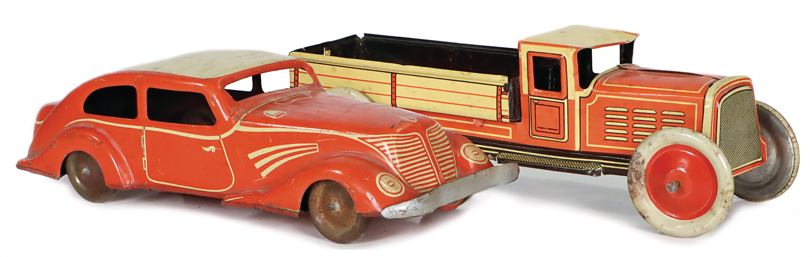 2 Art., Lkw, GL 160, Blech, lithogr., leichter Flugrost an Rädern, min. Lackschäden, L: 20 cm, Limousine, HK 550, Blech, lithogr., besp. Zustand, L: 22 cm