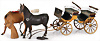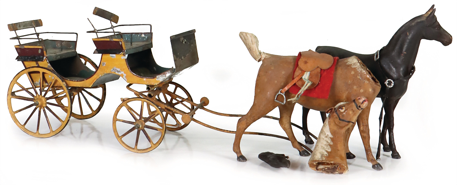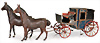 offene Kutsche, H: 10,5 cm, L: 25 cm, Blech, handlackiert, 2 Zugpferde, wohl original, Kopf eines Pferdes liegt lose bei, Schweif eines Pferdes liegt lose bei, Federblätter etw. verbogen, Dachbodenfund, Orig.-Zust.