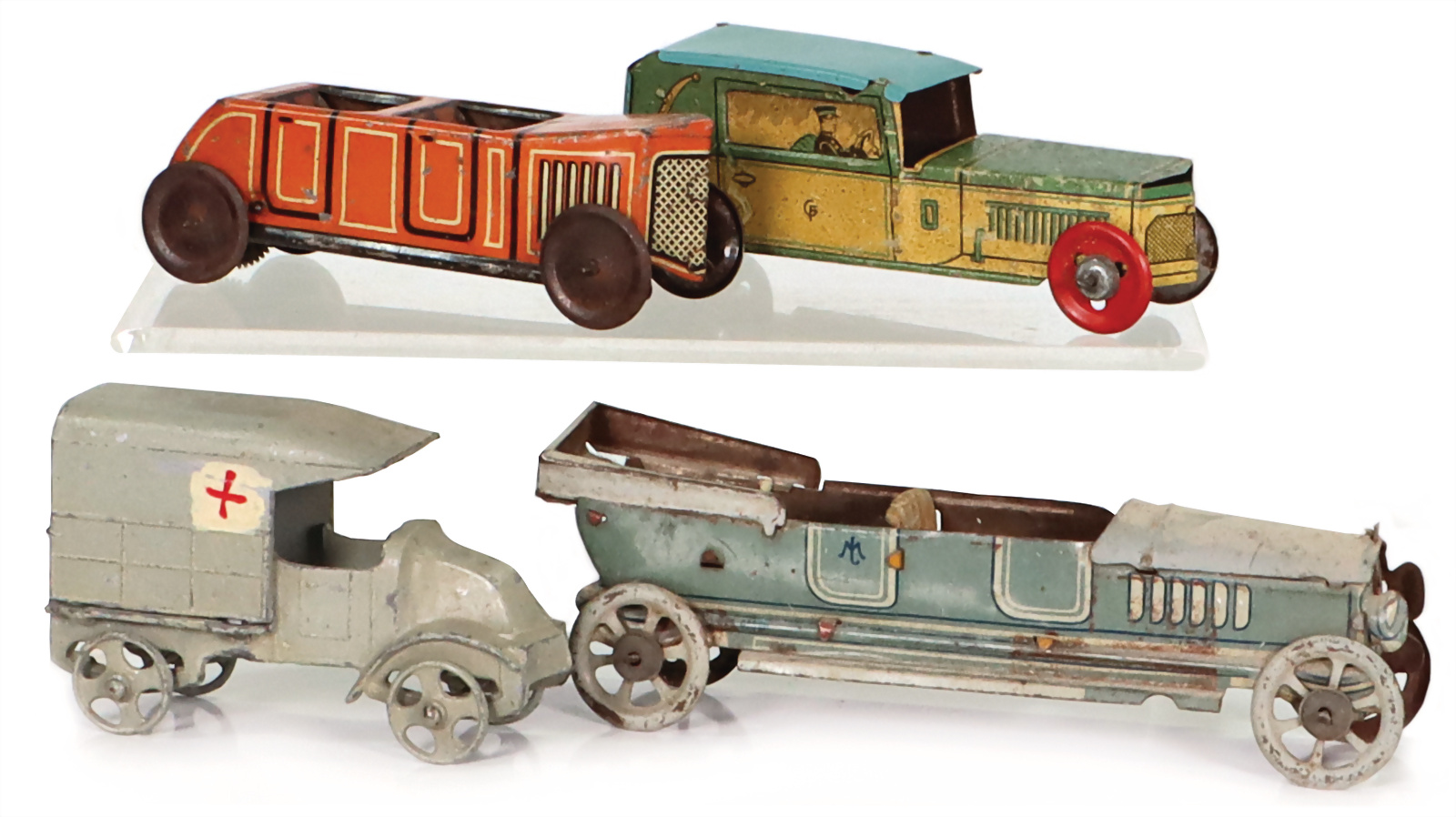 Konv., 4 Art., div. Fahrzeuge, Blech, lithogr., besp. Zust., Ersatzteilspender